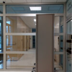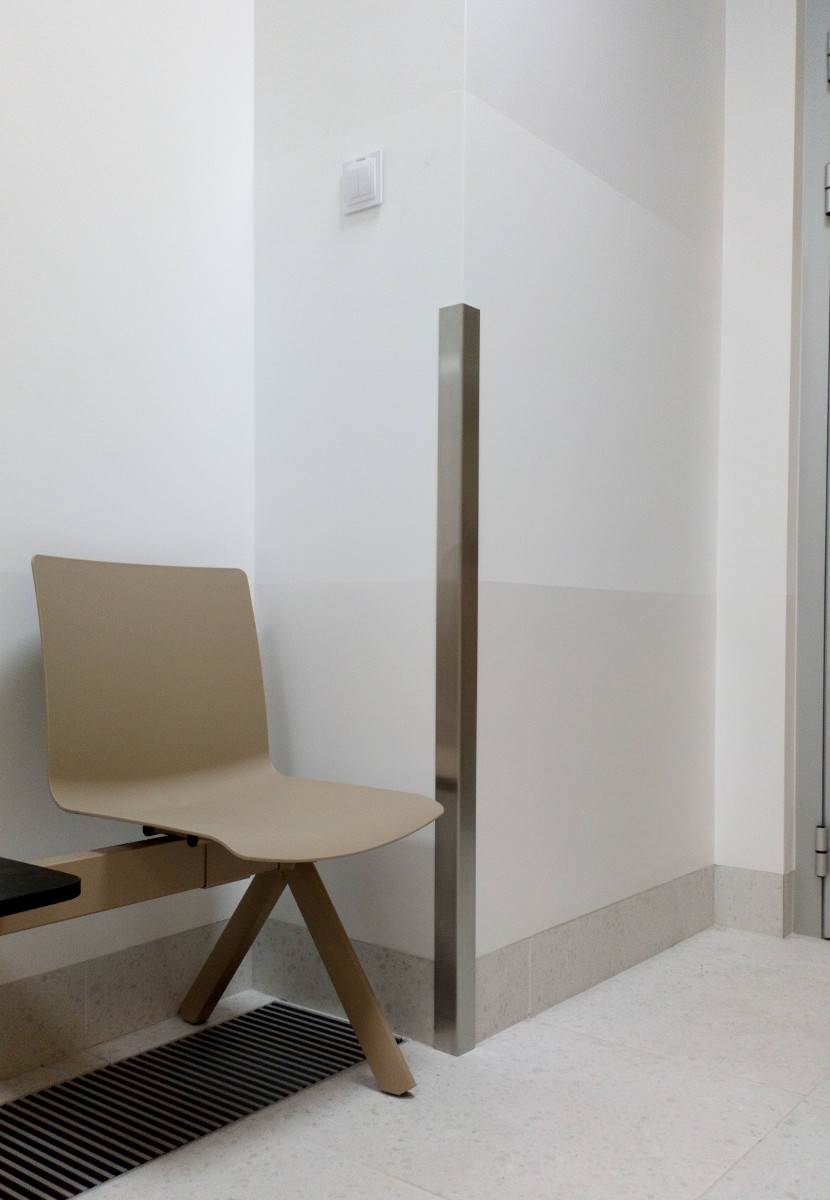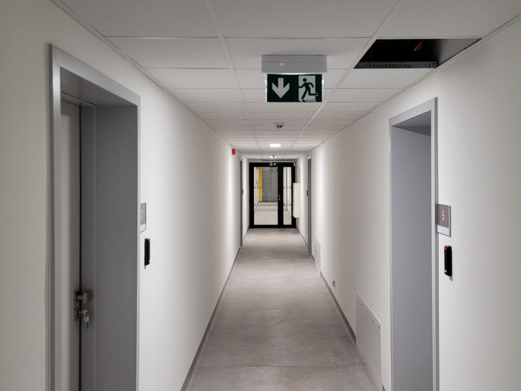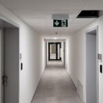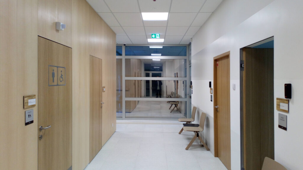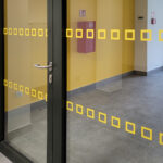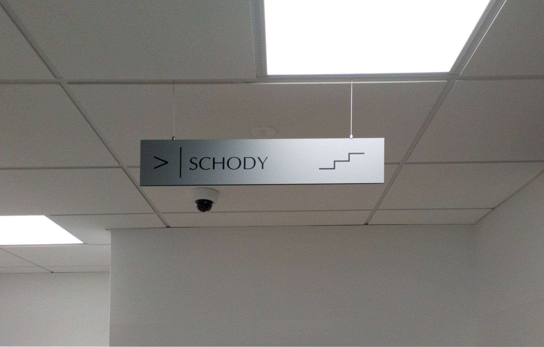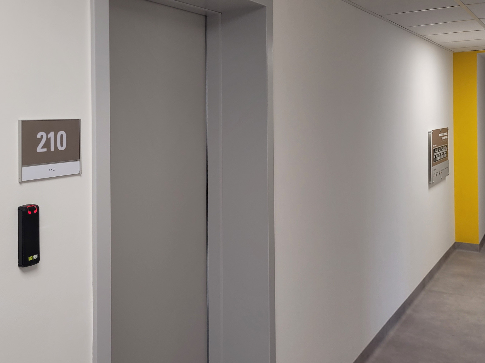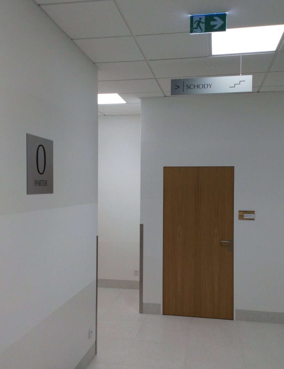 Tabliczki przydrzwiowe, tablice informacyjne oraz tablice kierunkowe z serii RHYTHM. Dodatkowo piktogramy informacyjne prostopadłe i numeracja drzwi.